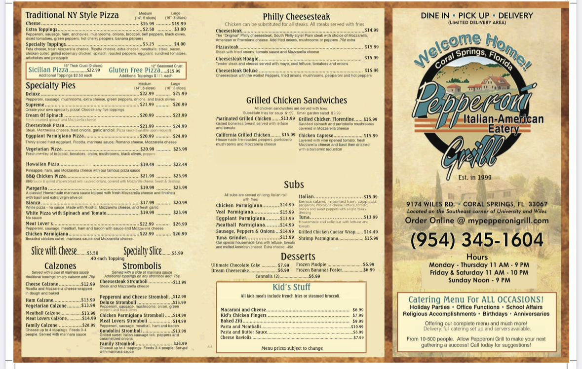 Welcome to Pepperoni Grill, a delightful pizza restaurant located at 9174 Wiles Rd, Coral Springs, FL. This hidden gem offers a menu brimming with hearty Italian dishes, perfect for both dine-in and takeout. The standout items include the Baked Ziti Penne and Lasagna, each crafted with authentic flavors that transport you straight to Grandma's kitchen.