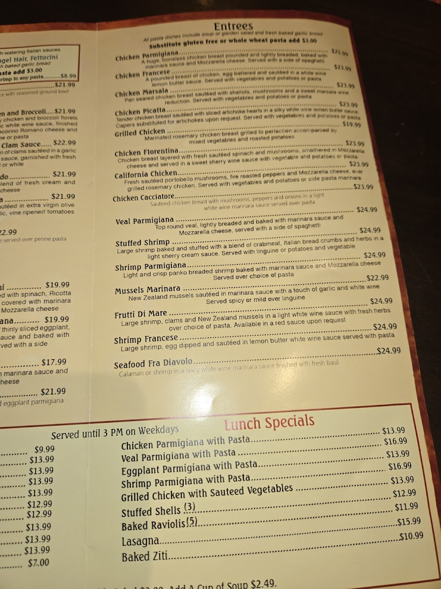 Breaded eggplant filled with spinach, ricotta and romano cheese, covered with marinara sauce and baked with mozzarella cheese.